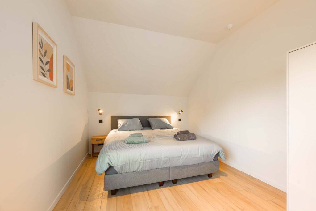 Deze kamer bevindt zich op de eerste verdieping en is uitgerust met een tweepersoonsbed boxspring (180cmx200cm). Voor een kind jonger dan drie jaar is er een spijlenbed aanwezig op deze kamer.